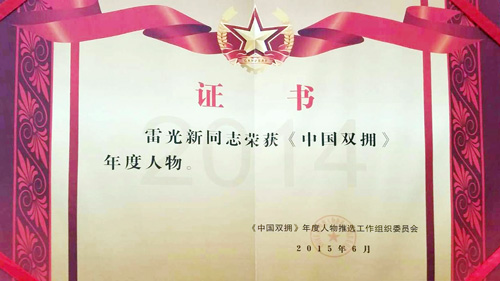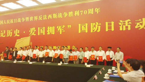 7月10日,雷光新董事長(zhǎng)在人民大會(huì)堂參加“紀(jì)念中國(guó)人民抗日戰(zhàn)爭(zhēng)暨世界反法西斯戰(zhàn)爭(zhēng)勝利70周年,銘記歷史·愛國(guó)擁軍”國(guó)防日活動(dòng),并同全國(guó)評(píng)選的十五位中國(guó)雙擁年度人物上臺(tái)領(lǐng)獎(jiǎng)。