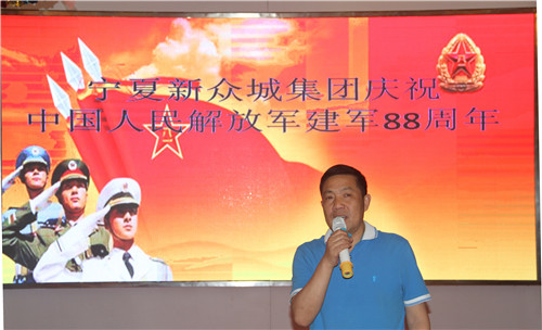 當(dāng)晚,集團(tuán)公司舉辦了慶祝建軍88周年聯(lián)誼活動,集團(tuán)雷光新董事長在聯(lián)誼活動上發(fā)表重要講話,他表示:軍隊是一個大熔爐,是一所大學(xué)校,培養(yǎng)了一代又一代的人才,是部隊讓我們從五湖四海為了同一個夢想走到了一起,讓我們團(tuán)結(jié)起來,為寧夏新眾城集團(tuán)的明天而努力奮斗!